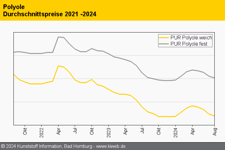 Der Abwärtstrend der vergangenen drei Monate hat sich fortgesetzt. Im August 2024 standen die Notierungen für MDI, TDI und Polyole weiter unter Druck, zumal die Urlaubszeit den ohnehin schon geringen Bedarf weiter dämpfte. Besonders schwach präsentierten sich die Bedarfe aus dem Automobilbau und dem Komfort-Segment. Der neuerliche Rückgang der Benzol-Referenz (-84 EUR/t) geriet vor diesem Hintergrund fast zum Nebenaspekt.
