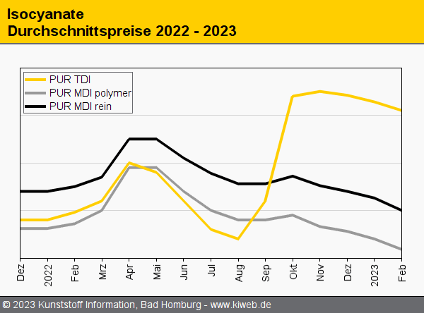 Die Notierungen für Isocyanate und Polyole setzten im Februar 2023 den Abwärtstrend der Vormonate fort. Die Nachfrage blieb schwach, zumal nur wenige Verarbeiter ihre Läger in größerem Stil wieder befüllten. Vor allem bei MDI gab es zudem günstige Importe, so dass der Markt weiterhin zur Länge neigte. Aber auch bei den Polyolen verkürzten sich die Lieferzeiten.