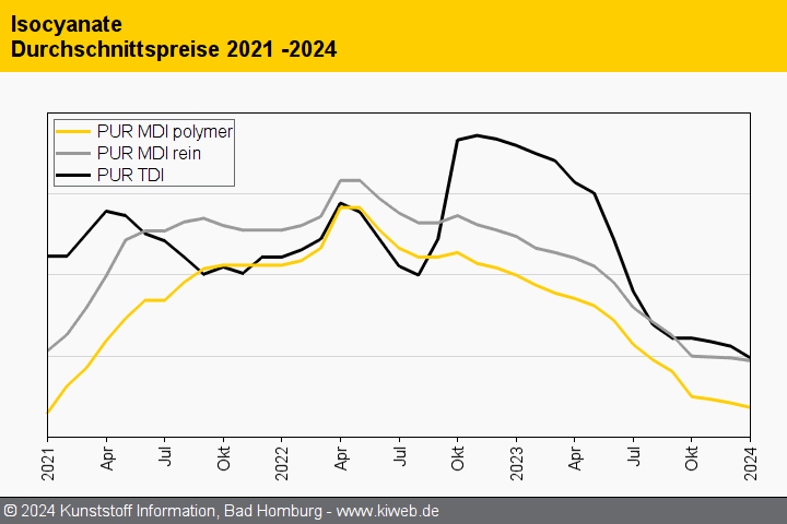 Vergeblich versuchten Erzeuger, die MDI-Preise anzuheben – die unverändert schwache Nachfrage machte ihnen einen Strich durch die Rechnung. Die Notierungen gaben sogar weiter nach. Breit gefächert zeigten sich die Abschlüsse bei TDI, die in einem überversorgten Markt vom Rollover bis hin zu dreistelligen Abschlägen reichten. Bei den Polyolen hat sich die Preistendenz derweil erstmals seit langem von den Isocyanaten entkoppelt: Bei einigen Typen, die schlechter verfügbar waren, konnten Anbieter leichte Preiserhöhungen durchsetzen, trotz der weiterhin schwachen Nachfrage.
