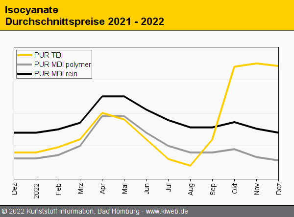 In den ersten beiden Wochen des Monats überwog sowohl bei den Isocyanaten als auch den Polyolen der Rollover. Im weiteren Verlauf hingegen kam es wegen vermehrt einströmender günstiger Importe zu ersten Preisrücknahmen auch der europäischen Erzeuger. Insbesondere TDI geriet gegen Monatsende recht deutlich unter Druck.