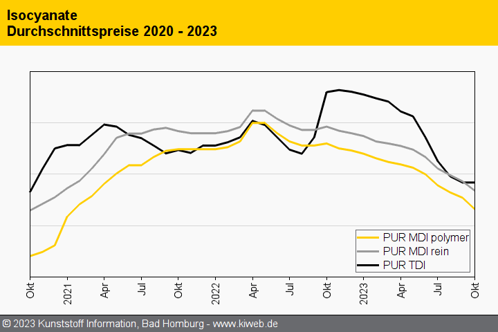 Der Anfang Oktober um sage und schreibe 232 EUR/t höher fixierte Benzol-Kontrakt beeindruckte die Isocyanate kaum. Der Markt befand sich zumindest in weiten Teilen fest im Würgegriff der schwachen Nachfrage. Verlockend günstige Importe sorgten deshalb bei den MDI-Typen für neuerliche kräftige Abschläge. Bei TDI hingegen verfing die gedrosselte europäische Produktion, woraus zunächst ein Rollover resultierte.