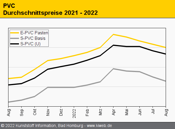 Der anteilige Preisrückgang bei Ethylen wurden bei der Preisrücknahme für das Basismaterial deutlich übertroffen. Das günstigere Basis-PVC sowie die schwache Nachfrage führten in der Folge bei allen berichteten Typen zu Rücknahmen oberhalb des anteiligen C2-Kostenabschlags. Weitere Preisrückgänge im September gelten zudem als sicher. Dies berichtet der Branchendienst Kunststoff Information (Bad Homburg) in dem aktuellen Online-Report.