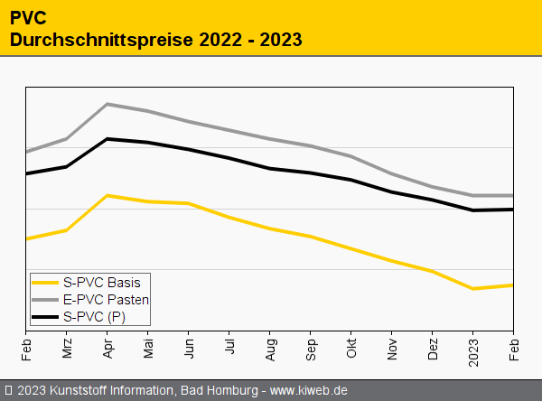 Nachdem die PVC-Notierungen seit April 2022 nur eine Richtung kannten, endete der Abwärtstrend im Februar: Die Preise für PVC und Compounds drehten – wenn auch nur marginal – nach oben. Erzeuger versuchten, die anteiligen Kosten für C2 in ihren Angeboten einzupreisen, hatten damit aber nur in begrenztem Umfang Erfolg. Bremsend wirkten die verhaltene Nachfrage in Verbindung mit dem mehr als ausreichenden Angebot.