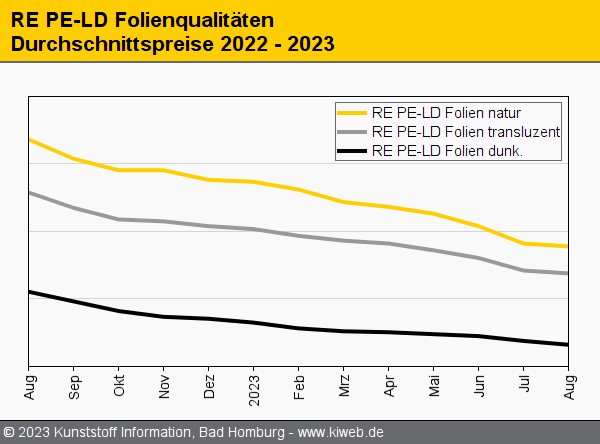 Die Notierungen kannten auch im August nur eine Richtung -- nach unten. Immerhin fielen die Abschläge bei mehreren Typen nicht mehr so hoch aus wie im Vormonat. Insgesamt gilt: Die Nachfrage war, bedingt durch die anhaltende Ferienzeit, aber auch die Konsumzurückhaltung der Verbraucher, sehr gering. Regranulierer reagierten mit Anlagendrosselungen auf die maue Nachfrage, trotzdem war der Markt ausreichend mit Material versorgt. Dies berichtet der Branchendienst Kunststoff Information (KI, Bad Homburg; ) im aktuellen Online-Report.