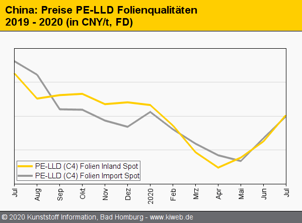 Mit Ausnahme von PS und PET kletterten die Preise für Standard-Thermoplaste auf dem chinesischen Markt im Juli 2020 höher. Der Preis für PE-LD stieg aufgrund niedriger Lagerbestände und höherer Rohölpreise deutlich an. Auch die Notierungen für PE-LLD, PE-HD, PVC und PP legten infolge des geringen Angebots und der höheren Rohstoffpreise zu. Der PS-Preis ging wegen höherer Lagerbestände zurück, während die PET-Preise mit sinkender Nachfrage fielen. Starke makroökonomische Zahlen stützten die insgesamt positive Stimmung. Dies berichtet der Branchendienst Kunststoff Information (KI, Bad Homburg) im aktuellen Online-Report.
