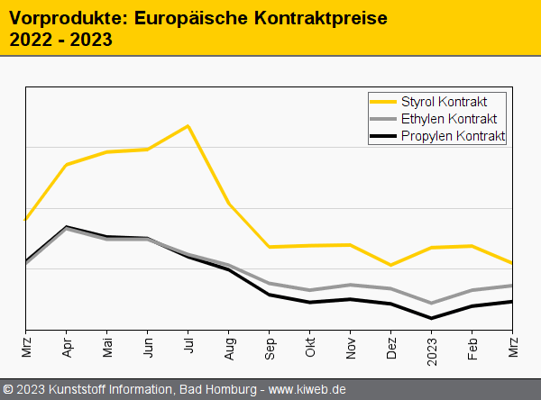 Die Preise der Polyolefine legten im ersten März-Drittel zu und folgten dabei weitgehend den Kostenvorgaben von C2 und C3 (beides +30 EUR/t). Ausnahmen bildeten lediglich die C6- und C8-Qualitäten von PE-LLD, wo die Aufschläge angesichts der robusten Nachfrage oft auch etwas höher ausfielen, sowie einfachere PE-LD-Materialien und EVA, bei denen Stand jetzt der Rollover im Gespräch ist. Die Preise der Styrolkunststoffe gaben im Windschatten der gesunkenen Styrol-Referenz (-113 EUR/t) hingegen nach, wobei die Abschläge für PS und EPS in den meisten Fällen nicht ganz den Umfang der SM-Kostenreduktion erreichten.