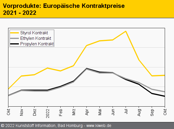 Ganz anders das Bild bei den Styrolkunststoffen: Im Oktober hatte das Vorprodukt Styrol nach dem heftigen Absturz der beiden Vormonate nun sogar ein leichtes Plus (+9 EUR/t) verzeichnet. Dennoch gaben die Preise für Polystyrol und EPS weiter nach, weil Produzenten die zuletzt rückläufigen Energiekosten berücksichtigten und die schwache Nachfrage zusätzlichen Druck erzeugte.