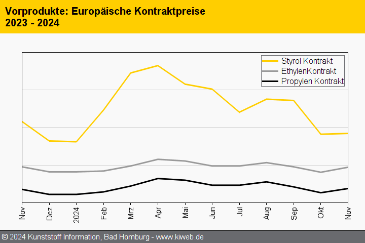 Der Rollover dominiert. Trotz gestiegener Monomerkosten (C2: +30 EUR/t, C3: +25 EUR/t, SM: +5 EUR/t) verharren die Preise vieler Standard-Thermoplaste Anfang November 2024 auf dem Vormonatsniveau. Angesichts der generell schwachen Nachfrage ist es den Produzenten nicht gelungen, höhere Preise durchzusetzen. Bei den meisten Polyethylen-Qualitäten erwirkten die Verarbeiter sogar leichte Preissenkungen, und bei EVA fielen die Abschläge aufgrund der Konkurrenz durch Importwaren noch einmal deutlicher aus. Aktuell sind nur bei PVC Preisanhebungen im Gespräch – und auch hier ist es sehr fraglich, ob sich diese Tendenz bis zum Monatsende halten wird.