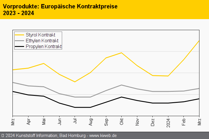 Die Notierungen der Standard-Thermoplaste streben im März weiter nach oben. Schub erhalten sie durch die gestiegenen Kosten für die Vorprodukte C2 (+30 EUR/t), C3 (+35 EUR/t) und Styrol (+222 EUR/t). Bei den Polyolefinen kommen noch Verfügbarkeitsprobleme hinzu, so dass Produzenten Aufschläge fordern, die über die Monomerverteuerung zum Teil deutlich hinausgehen. Allerdings befinden sich die Preisverhandlungen aber noch in einem frühen Stadium – insbesondere bei PE, da der C2-Kontrakt diesen Monat erst sehr spät fixiert wurde.