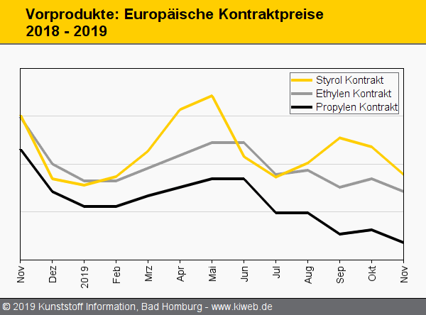 Nach den Abstufungen bei nahezu allen Vorprodukten geht es Anfang November 2019 mit den europäischen Preisen der Standard-Thermoplaste wie abzusehen abwärts. Bis auf wenige Ausnahmen sind die Kostensenkungen bereits voll oder zumindest nahezu eingepreist. In den allermeisten Fällen ist zudem von noch weiteren Nachlässen auszugehen, wenn auch nicht in sehr großem Stil. Das berichtet der Branchendienst KI Kunststoff Information (Bad Homburg) im Trendreport zum ersten Monatsdrittel.