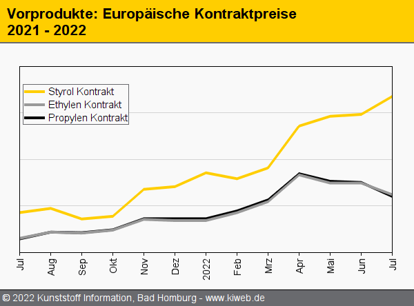 Der Markt hat sich gedreht – von einem Verkäufer- hin zu einem Käufermarkt. Bei den Polyolefinen und bei PVC gaben die Notierungen im ersten Drittel des Juli 2022 bereits deutlich nach. Angesichts der schwachen Nachfrage und einer verbesserten Angebotslage durch vermehrte Importe gibt es Abschläge, die die dreistelligen Rückgänge der Vorproduktkosten von Ethylen (-100 EUR/t) und Propylen (-120EUR/t) noch einmal übertreffen. Gegen den Abwärtstrend stemmen sich derweil die Styrolkunststoffe, die Preise für Polystyrol und EPS klettern im Windschatten der benzolgetriebenen Styrol-Referenz (+155 EUR/t) sogar auf neue Allzeithochs – trotz einer auch hier generell abflauenden Nachfrage.
