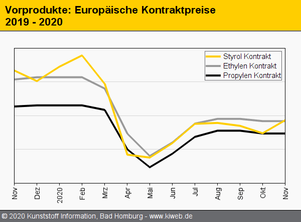 Die Notierungen der Olefine wurden Anfang November 2020 nach dem Rollover bei C2 und C3 auf dem Vormonatsniveau fortgeschrieben oder – bei etwaigen Limitierungen der Verfügbarkeit – leicht angehoben. Deutliche Aufschläge verzeichneten hingegen die Styrolkunststoffe und PVC. Bei ersteren wirkte vor allem der Anstieg der SM-Referenz (+58 EUR/t) preistreibend, und bei PVC nutzten die Anbieter die weiterhin enge Marktsituation für zusätzliche Margenverbesserungen. Die Nachfrage gestaltete sich bei den Polyolefinen eher verhalten, bei den übrigen Werkstoffen recht ordentlich. Dies berichtet der Branchendienst Kunststoff Information (KI, Bad Homburg) im aktuellen Online-Report.
