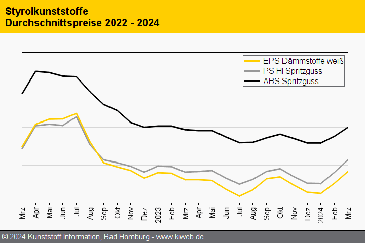 Im März 2024 haben abermals sprunghaft gestiegene Styrol-Kosten – der Referenzkontrakt schoss um 222 EUR/t nach oben – die Preise für Polystyrol, EPS und ABS weiter in die Höhe getrieben. Bei Polystyrol erreichten die Preisanhebungen oft die volle Höhe der Monomerverteuerung oder lagen nur knapp darunter, und bei auch EPS fielen die Aufschläge nur leicht niedriger aus. Die Notierungen für ABS zogen ebenfalls kräftig an, da die Anbieter meist die komplette Einpreisung der um etwa 150 EUR/t gestiegenen Kompositkosten verlangten oder zuweilen – insbesondere bei Extrusionsmaterialien – auch etwas mehr.