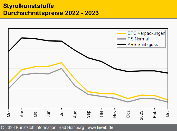 Die Styrol-Referenz sackte im März 2023 um 113 EUR/t nach unten, und die Styrolkunststoffe folgten der Vorgabe – auch weil die Erzeuger in Anbetracht der schwachen Nachfrage und des üppigen Angebots dem nicht wirklich etwas entgegenzusetzen hatten. Einige Produzenten versuchten wegen ihrer Ansicht nach zu dünner Margen, die Preissenkungen unterhalb der Styrol-Kostenreduktion zu halten. Am ehesten gelang ihnen dies bei Polystyrol, während EPS teilweise Abschläge sogar jenseits des SM-Rückgangs verzeichnete. Auch bei ABS fielen die Preisrücknahmen nicht immer niedriger aus als der Rückgang der Kompositkosten. Dies berichtet der Branchendienst Kunststoff Information (KI, Bad Homburg) im aktuellen Online-Report.