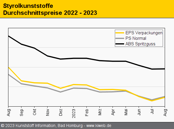Die Notierungen der Styrolkunststoffe drehten im August 2023 wieder nach oben und setzten damit dem Abwärtstendenz der vergangenen Monate ein Ende. Grund für die Preisumkehr waren die gestiegenen Styrolkosten – der SM-Referenzkontrakt legte um 108 EUR/t zu. Produzenten, die nicht rückwärts integriert sind, mussten an den Spotmärkten mit noch höheren Kostensteigerungen zurechtkommen. Sie verlangten in der Regel auch höhere Aufschläge. Dies berichtet der Branchendienst Kunststoff Information (KI, Bad Homburg) im aktuellen Online-Report.