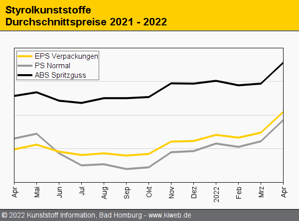 Der heftige Styrol-Kostenanstieg im April (+360 EUR/t) hat die Preise sämtlicher Styrolkunststoffe auf neue Rekordhöhen getrieben. Steil nach oben schossen im Fall von ABS auch die Notierungen der übrigen Komponenten Butadien (+200 EUR/t) und ACN (+400 EUR/t). Auf die Weitergabe der Rohstoffkosten packten die meisten Erzeuger von PS, EPS und ABS auch noch eine zusätzliche Komponente, um die ebenfalls stark gestiegenen Energiekosten aufzufangen. Da die Energiekosten im Monatsverlauf aber wieder zurückgingen, revidierten einige Produzenten die Aufschlagshöhe wieder etwas nach unten. Die Folge war eine recht große Preisspanne bei den Abschlüssen, insbesondere bei PS und ABS.
