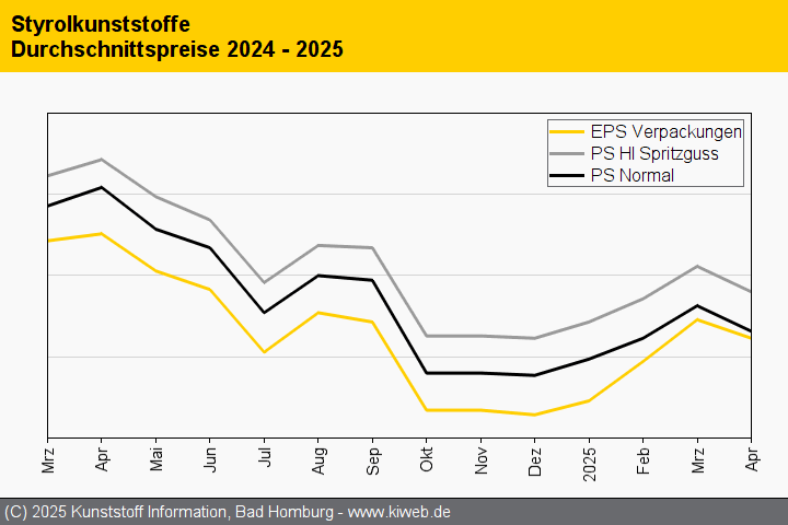 Die Hausse ist zu Ende: Im April drehten die Preise für Styrolkunststoffe erstmals seit drei Monaten wieder nach unten. Maßgeblich dafür war die Berücksichtigung der Kostenreduktion für Rohstoffe, insbesondere für Styrol. Bei Polystyrol richtete sich die Höhe der Abschläge nach dem Rückgang der SM-Referenz. Auch bei ABS folgten die Preise maßgeblich den gesunkenen Kompositkosten.