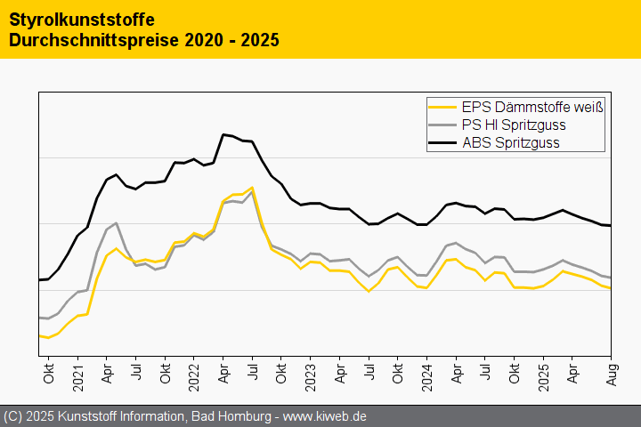 Im August tendierten die Preise für Styrolkunststoffe den fünften Monat in Folge nach unten. Unter Druck gerieten die Notierungen durch den neuerlichen Rückgang des Referenzkontrakts für Styrol (-35 EUR/t) und die schwache Nachfrage, die in der Hochphase der Urlaubszeit einen zusätzlichen Dämpfer erhielt.