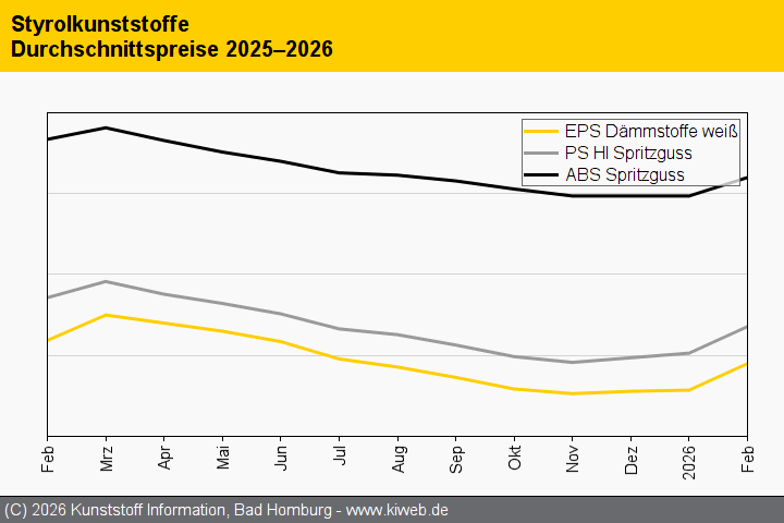 Erneut legten die Märkte für Styrolkunststoffe wenig Preisfantasie an den Tag: Bei sämtlichen Werkstoffen folgten die Notierungen recht dicht der Kostenentwicklung der Vorprodukte. Polystyrol und EPS orientierten sich weitgehend an der Styrol-Referenz, auch wenn deren Anstieg von 120 EUR/t angesichts der schwachen Nachfrage und eines reichlichen Angebots nicht immer im vollen Umfang eingepreist wurde.