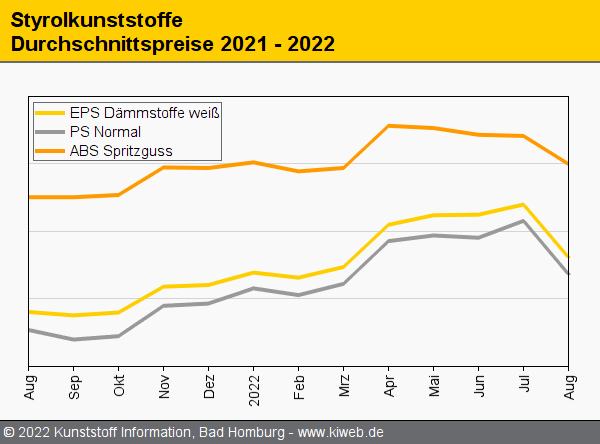 Nach dem Absturz der Styrol-Referenz um 509 EUR/t war bereits früh im August klar, dass die Preise der Styrolpolymere folgen würden. Dabei tat sich bei den Abschlägen für Polystyrol, ABS und EPS eine Spanne von -400 EUR/t bis -500 EUR/t auf. Dies berichtet der Branchendienst Kunststoff Information (Bad Homburg) im aktuellen Online-Report.
