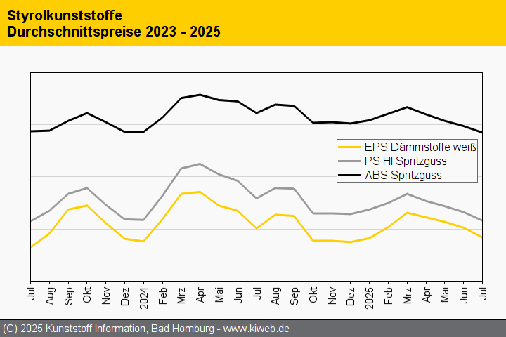 Die Preise für Styrolkunststoffe gaben im Juli 2025 den vierten Monat in Folge nach. EPS-Dämmstoffe markierten den niedrigsten Stand seit Januar, Polystyrol war so günstig wie seit zwei Jahren nicht mehr und ABS Spritzguss war sogar so billig wie zuletzt im Februar 2021. Doch so rechte Freude darüber wollte bei keinem aufkommen, weder bei Anbietern noch bei Verarbeitern. Denn die Mengen ließen zu wünschen übrig, und auch die Margen stimmen nicht. „Gegenwärtig verdient niemand Geld“, klagte ein Teilnehmer der KI-Preisumfragen.