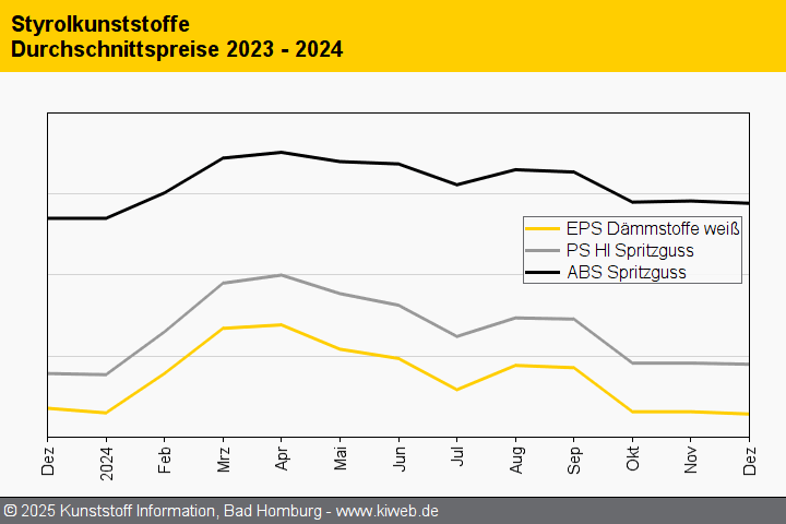 Die Notierungen der Styrolkunststoffe verzeichneten einen unspektakulären Jahresausklang. Nach dem marginalen Rückgang der Styrol-Referenz (-7 EUR/t) blieben die Preise für Polystyrol, EPS und ABS im Dezember 2024 unverändert oder wurden geringfügig zurückgesetzt – somit prägte ein schwacher Rollover das Geschehen.