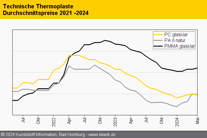 PMMA sind die einzigen, die neben PBT die Preise nach oben zogen. Das wird so bleiben, denn die weltweite Versorgungslage mit PMMA ist schlecht – und Besserung nicht in Sicht. Die Gemengelage am Markt aus europäischer Produktion und Importen war so kompliziert und komplex, dass sie den Erzeugern in die Karten spielte und die Preise hochzuhalten half. Dies berichtet der Branchendienst Kunststoff Information (KI, Bad Homburg; ) im aktuellen Online-Report.