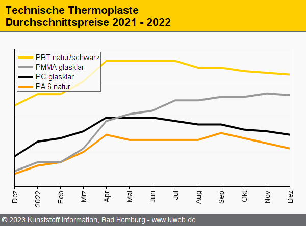 Wenig überraschend angesichts der schwachen Nachfrage gaben die Notierungen aller berichteten Typen technischer Thermoplaste im Dezember nach. Für PMMA war es sogar der erste kleine Abschlag seit annähernd zwei Jahren.