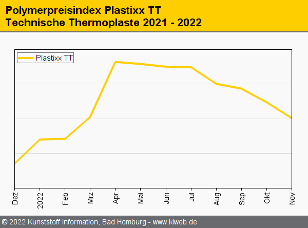 Im November 2022 setzten die Notierungen fast aller technischen Thermoplaste den Abwärtstrend der Vormonate fort. Gründe dafür waren die Reduzierung der Energiekostenzuschläge, der Preisdruck durch günstige Importe sowie die allgemein schwache Nachfrage. Ein Übriges tat der Abbau von Lagerbeständen seitens der Verarbeiter. Dieser widrigen Gemengelage hatte auch der Benzol-Anstieg (+42 EUR/t) in der Vorproduktstrecke einiger Werkstoffe nichts entgegenzusetzen. Dies berichtet der Branchendienst Kunststoff Information (Bad Homburg) im aktuellen Online-Report.