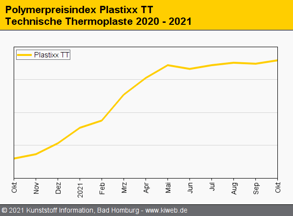 Für einige technische Thermoplaste ging es im Oktober weiter aufwärts – zum Teil auch deutlich -, während sich die Preise für Polycarbonat, Polyamid 6 und POM kaum verändert zeigten. Die wegen der erst gegen Ende Oktober wieder angefahrenen Vorproduktanlagen in Europa noch immer beeinträchtigten PA 6.6-Compounds markierten einen neuen Höchststand, der erstmals über der Marke von 6.000 EUR/t lag. Die Nachfrage hielt sich bis Monatsmitte Oktober noch auf halbwegs akzeptablem Niveau – abgesehen vom Automobilbau. Spätestens mit dem Ende der Bausaison dürfte jedoch eine Trendwende einsetzen. Dies berichtet der Branchendienst Kunststoff Information (KI, Bad Homburg) im aktuellen Online-Report.